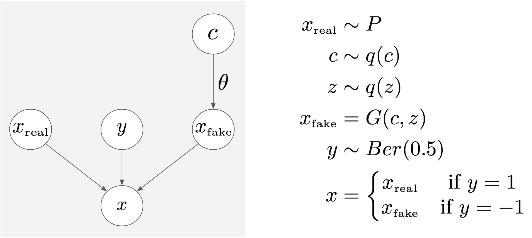 - $x_{fake}$ is a synthetic sample we draw from the generator, conditioned on $c$. When generating $x_{fake}$, additional noise variables $z$ provide for non-deterministic behaviour. In the graph above I don't show $z$, instead I think it's better to think of the problem with $z$ marginalised out, and $x_{fake}$ to be sampled from some conditional distribution $q(x_{fake}\vert c;\theta)$, which is parametrised by $\theta$.