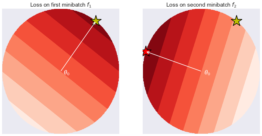 The left-hand panel shows an imaginary loss function evaluated on some minibatch $f_1$, restricted to the $\epsilon$-ball around $\theta$. We can assume $\epsilon$ is small enough so $f_1$ is linear within this local region. Unless the gradient is exactly $0$, the minimum will fall on the surface of the $\epsilon$-ball, exactly at $\theta - \epsilon \frac{g_1}{|g_1|}$ where $g_1$ is the gradient of $f_1$ at $\theta$. This is shown by the yellow star. On the right-hand panel I show $f_2$. This is also locally linear, but its gradient $g_2$ might be different. The minimum of $f_2$ within the $\epsilon$-ball is at $\theta - \epsilon \frac{g_2}{|g_2|}$, shown by the red star. We can consider the regret-type expression as above, by evaluating $f_2$ at the yellow star, and substracting its value at the red star. This can be expressed as follows (I divided by $\epsilon$):