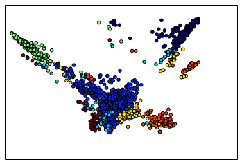 When I looked at the figure that Laplacian eigenmaps produced, one thing was immediately clear: the data separates into 5-10 distinct clusters. So my next task was to identify these clusters.