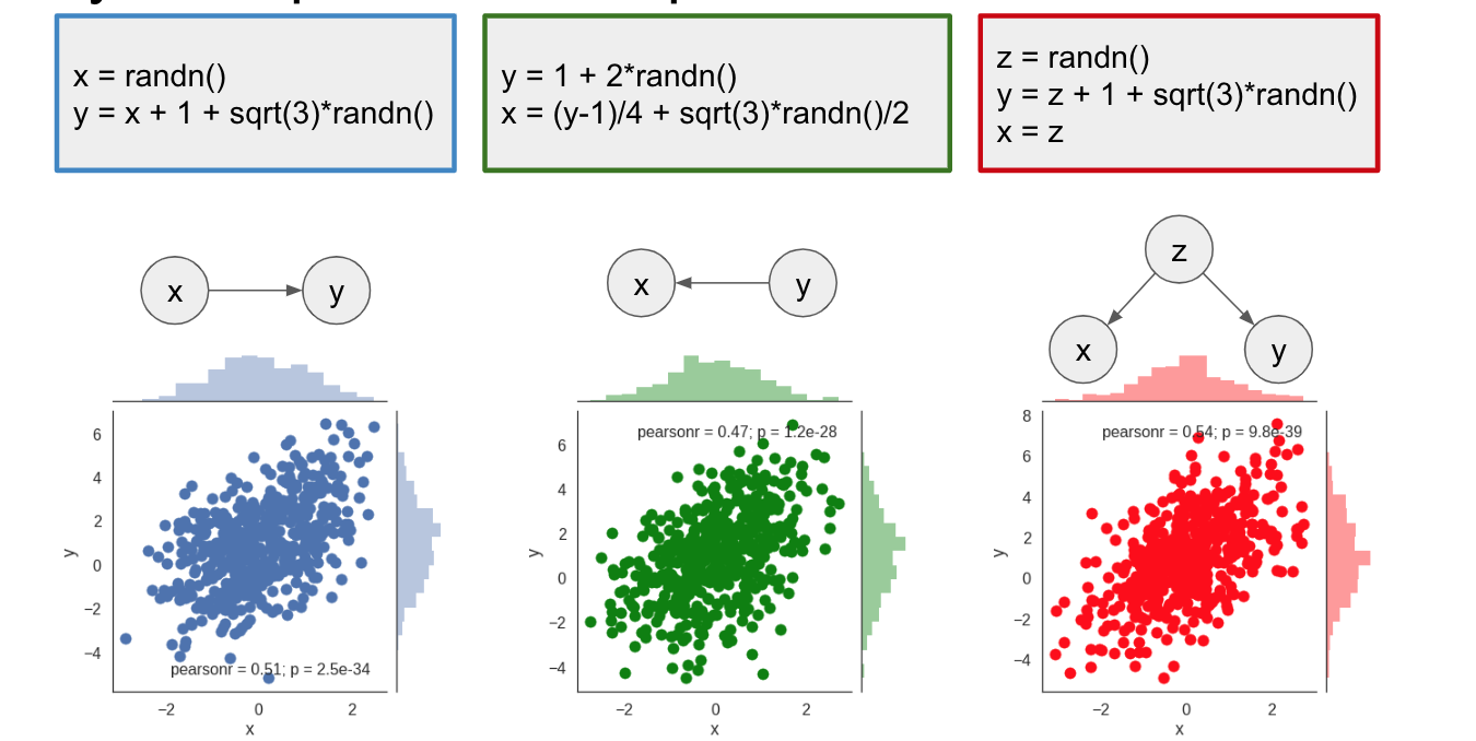 We can see that, even though they produce the same joint distribution, the scripts have different causal diagrams. And this additional knowledge of the causal structure allows us to make inferences about intervention without actually running experiments with that intervention. To do this in general setting, we can use do-calculus, explained in a little bit more detail in my earlier post.