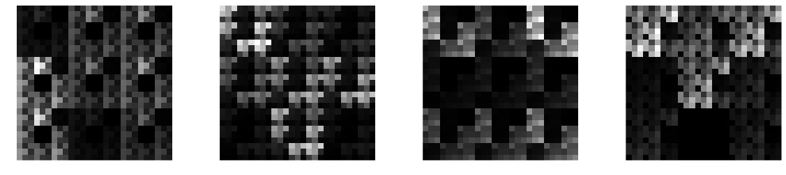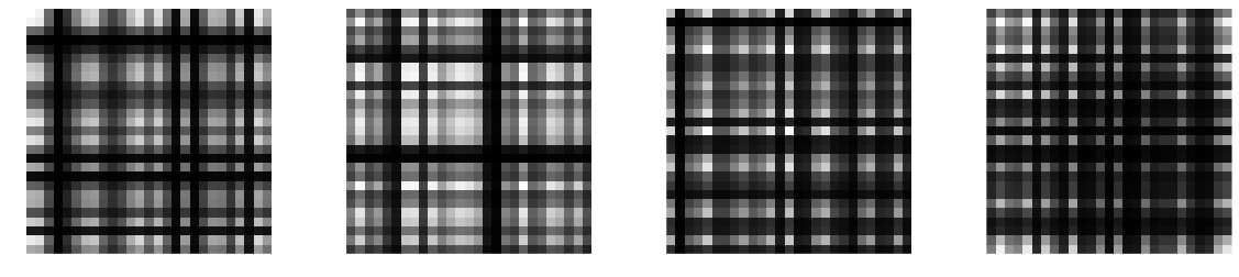 Let's look at what kind of kernels can we represent with Kronecker products, and hence what behaviour should we expect from dilated convolutions. Here are a few examples of $27\times 27$ kernels that result from taking the Kronecker product of three random $3\times 3$ kernels: