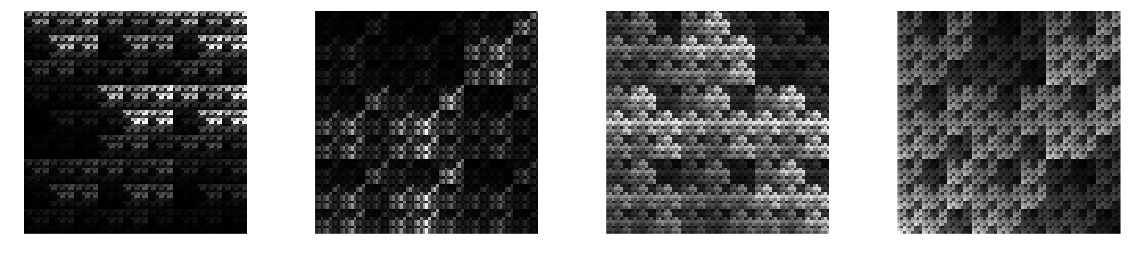 These look somehow natural, at least to me. They look like pretty plausible texture patches taken from some pixellated video game. You will notice the repeated patterns and the hierarchical structure. Indeed, we can draw cool self-similar fractal-like filters if we keep taking the Kronecker product of the same kernel with itself, some examples of such random fractals: