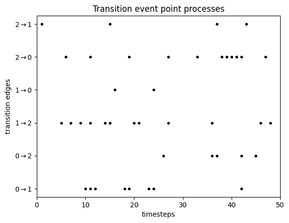 This plot has one line for each transition from a state $i$ to another state $j$. For each of these we drew transition points from a point process. Notice how some of the lines are denser - this is because the corresponding transition probabilities are higher. This is the transition matrix I used: