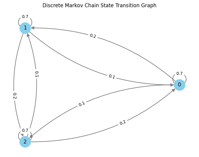 Discrete Markov chains are fully described by a collection of state transition matrices $P_t = [P(X_{t+1} = i\vert X_{t}=j)]{i,j}$. Note that this matrix $P_t$ is indexed by the time $t$, as it can, in general, change over time. If $P_t = P$ is constant, we call the Markov chain homogeneous.