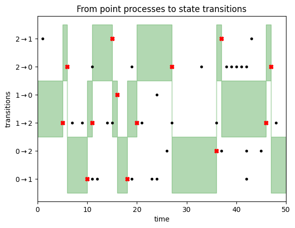 We start the Markov chain in state $1$. We therefore focus on the transitions $1\rightarrow 0$ and $1 \rightarrow 2$, as highlighted by the green area on the left side of this figure. We stay in state $1$ until we encounter a transition event (black dot) for either of these two transitions. This happens after about 5 timesteps, as illustrated by the red cross. At this point, we transition to state $2$, since the first transition event was observed in the $1 \rightarrow 2$ row. Now we focus on transition events for lines $2\rightarrow 1$ and $2\rightarrow 0$, i.e. the top two rows. We don't have to wait too long until a transition event is observed, triggering a state update to state $0$, and so on. You can read off the Markov chain states from where the green focus area lies.