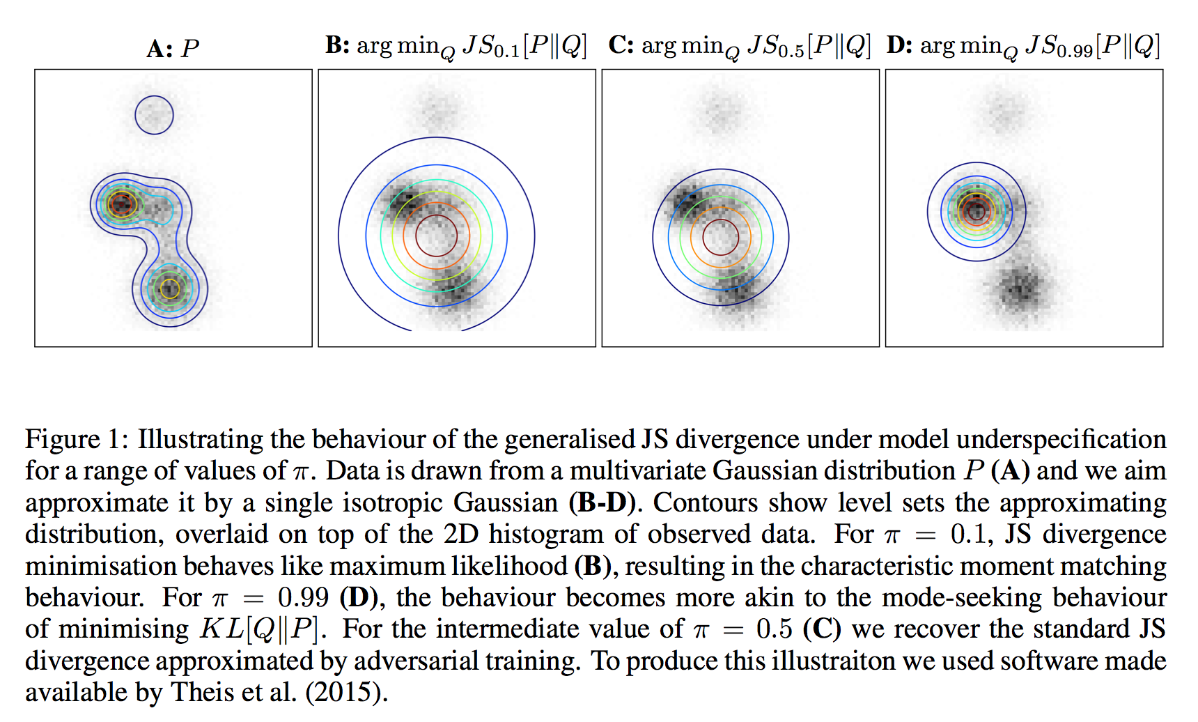 Looking at the equation above you can immediately see how it's related to this topic. JS divergence is a bit like a symmetrised version of KL divergence. It's not $KL[P|Q]$, not $KL[Q|P]$, but a bit of both. So one can expect that minimising JS divergence would exhibit a behaviour that is kind of halfway between the two extremes explained above. And that means that they would generate better samples than methods trained via maximum likelihood and similar objectives.