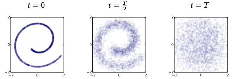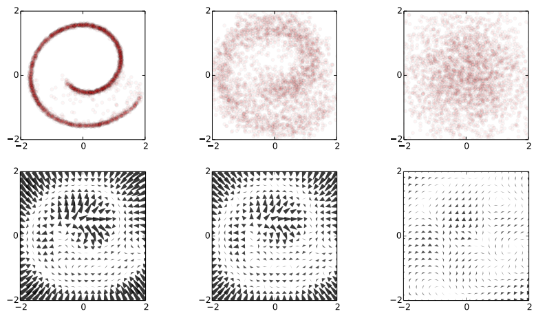 Now the trick the authors used is to train a dynamical system to inverts this random walk, to be able to reconstruct the original data distribution from the random Gaussian noise. Amazingly, this works, and the traninig objective becomes very similar to variational autoencoders. Below is a figure showing what happens when we try to reconstruct data in the Swiss roll example: The top images from right to left: we start with a bunch of points drawn from random noise (top right). We apply the inverse nonlinear transformation to these points (top middle). Over time points will be pushed towards the original Swiss roll manifold (top left).