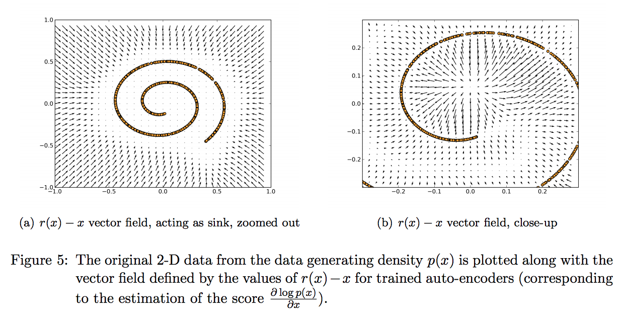 Another vector field we often encounter in machine learning (but don't often think of it as a vector field) is the one defined by an autoencoder. An AE, too, takes as input some vector $x$ and returns another vector $v(x)$ which is the same size. Figure 5 of (Alain and Bengio, 2014) illustrates the vector field of denoising autoencoders trained on 2D data pretty nicely: