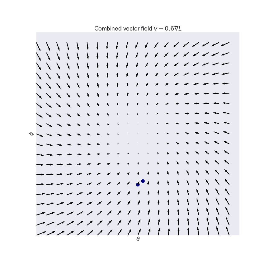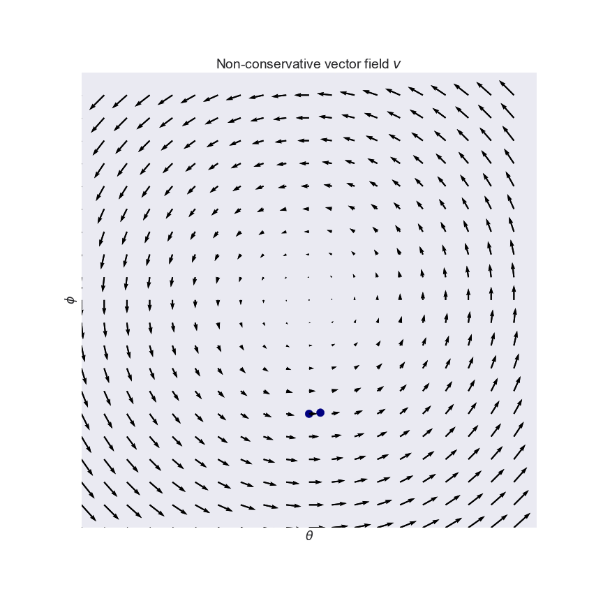 This is great. Familiar gradient descent on $L$ converges to a local minimum, which is a fix point of $v$. The problem now is, we have no control over what kind of fix point we converge to. We seek positive equilibria, but $-\delta L$ can't differentiate between saddle points or equilibria, or between negative or positive equilibria. This is illustrated on this slightly more bonkers vector field $v(\theta, \phi) = (cos(\phi), sin(\theta))$: