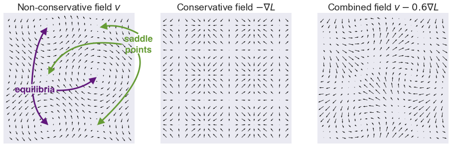 On the left-hand plot I annotated equilibria and saddle points. The middle plot shows the conservative relaxation $-\nabla L$ where both saddle points and equilibria are turned to local minima.
