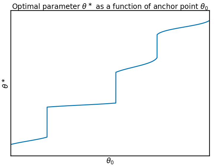 So it's clear that there is a non-trivial, non-linear relationship between the anchor-point $\theta_0$ and the location of a local minimum $\theta^\ast$. Let's plot this relationship as a function of the anchor point: