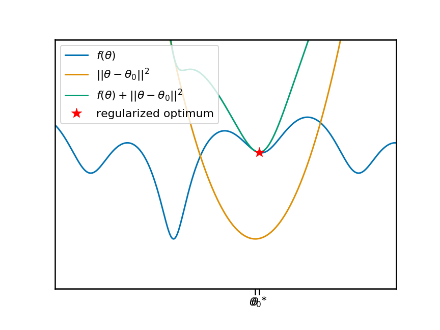 In the figure above, let's say that we would like to minimise an objective function $f(\theta)$. This would be the training loss of one of the tasks the meta-learning algorithm has to solve. Our current meta-parameter $\theta_0$ is marked on the x axis, and the orange curve shows the associated quadratic penalty. The teal curve shows the sum of the objective with the penalty. The red star shows the location of the minimum, which is what the learning algorithm finds.