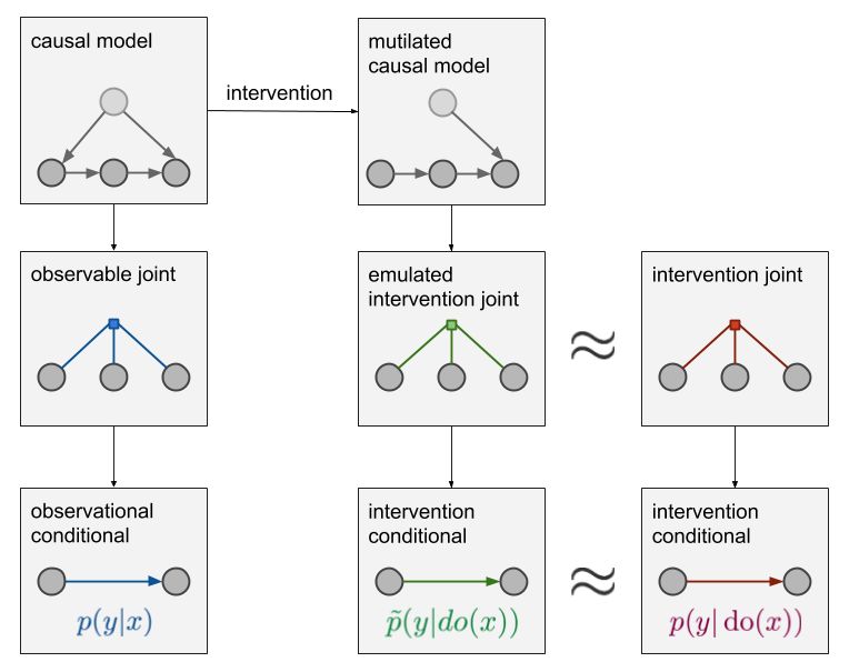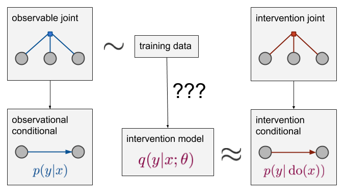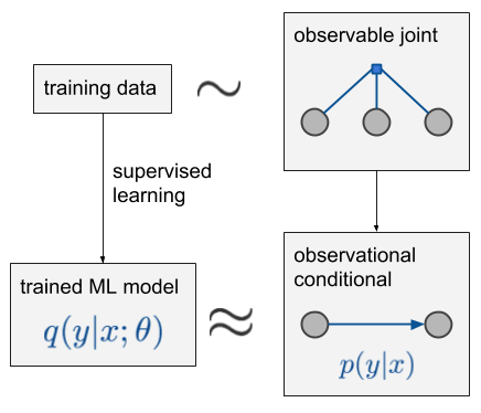 Let's say we observe 3 variables, $x, z, y$, in this order. Data is sampled i.i.d. from some observable joint distribution over 3 variables, denoted by the blue factor graph labelled 'observable joint'. If you don't know what a factor graph is, it's not important, the circles represent random variables, the little square represents a joint distribution of the variables it's connected to. We are interested in predicting $y$ from $x$, and say that $z$ is a third variable which we do not want to infer but we can also measure (I included this for completeness). The observational conditional $p(y\vert x)$ is calculated from this joint via simple conditioning. From the training data we can build a model $q(y\vert x;\theta)$ to approximate this conditional, for example using a deep net minimizing cross-entropy or whatever.
