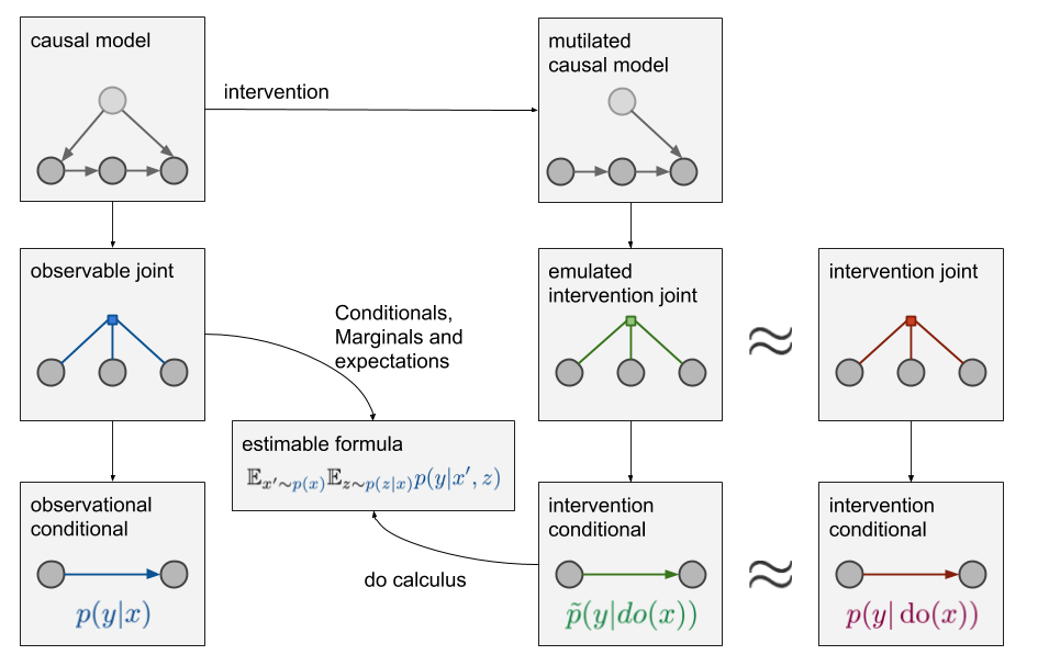 Coming up with a causal model is a modeling step where we have to consider assumptions about how the world works, what causes what. Once we have a causal diagram, we can emulate the effect of intervention by mutilating the causal network: deleting all edges that lead into nodes in a $do$ operator. This is shown on the middle-top panel. The mutilated causal model then gives rise to a joint distribution denoted by the green factor graph. This joint has a corresponding conditional distribution $\tilde{p}(y\vert do(x))$, which we can use as our approximation of $p(y\vert do(x))$. If we got the causal structure qualitatively right (i.e. there are no missing nodes and we got the direction of arrows all correct), this approximation is exact and $\tilde{p}(y\vert do(x)) = p(y\vert do(x))$. If our causal assumptions are wrong, the approximation may be bogus.