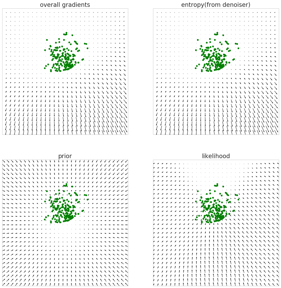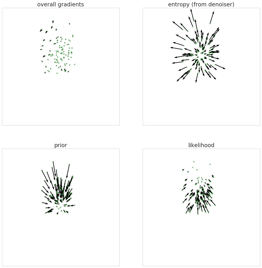 Here's another interesting figure to look at: gradients from different components of the loss function: entropy of Q, log prior and log likelihood. Here I'm plotting a quiver plot of negative gradients so you can see which way gradient descent will try to push each sample: