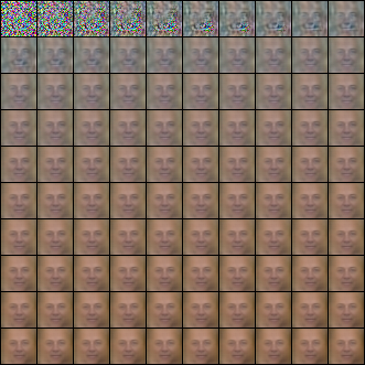 The intuition of using denoisers is this: A good denoiser is specific the distribution of data you're dealing with. It takes any input and moves it to a nearby point that lies in a higher density region. Here is a simple fun example where I train a denoiser neural network on Celeb-A faces. Then I start from random noise (top left), apply the denoiser iteratively, over and over again. This process quickly takes us to high-density region of face-looking things, and eventually converges to a fix-point which is roughly going to be the mode of the distribution: